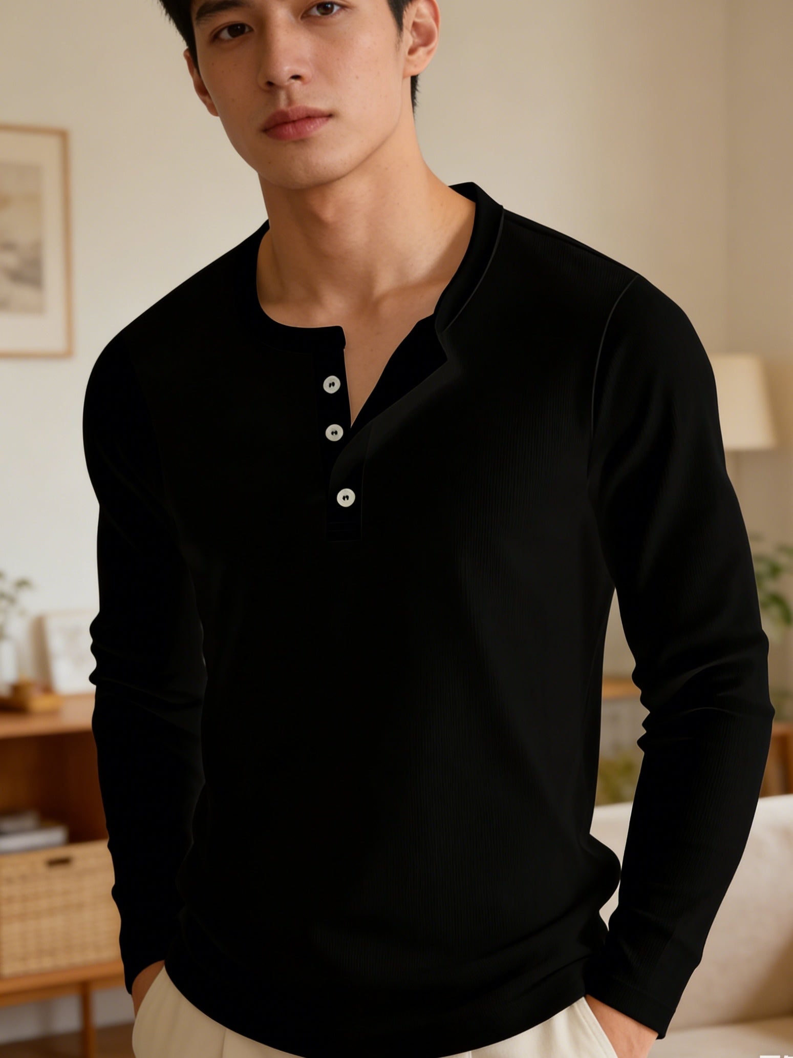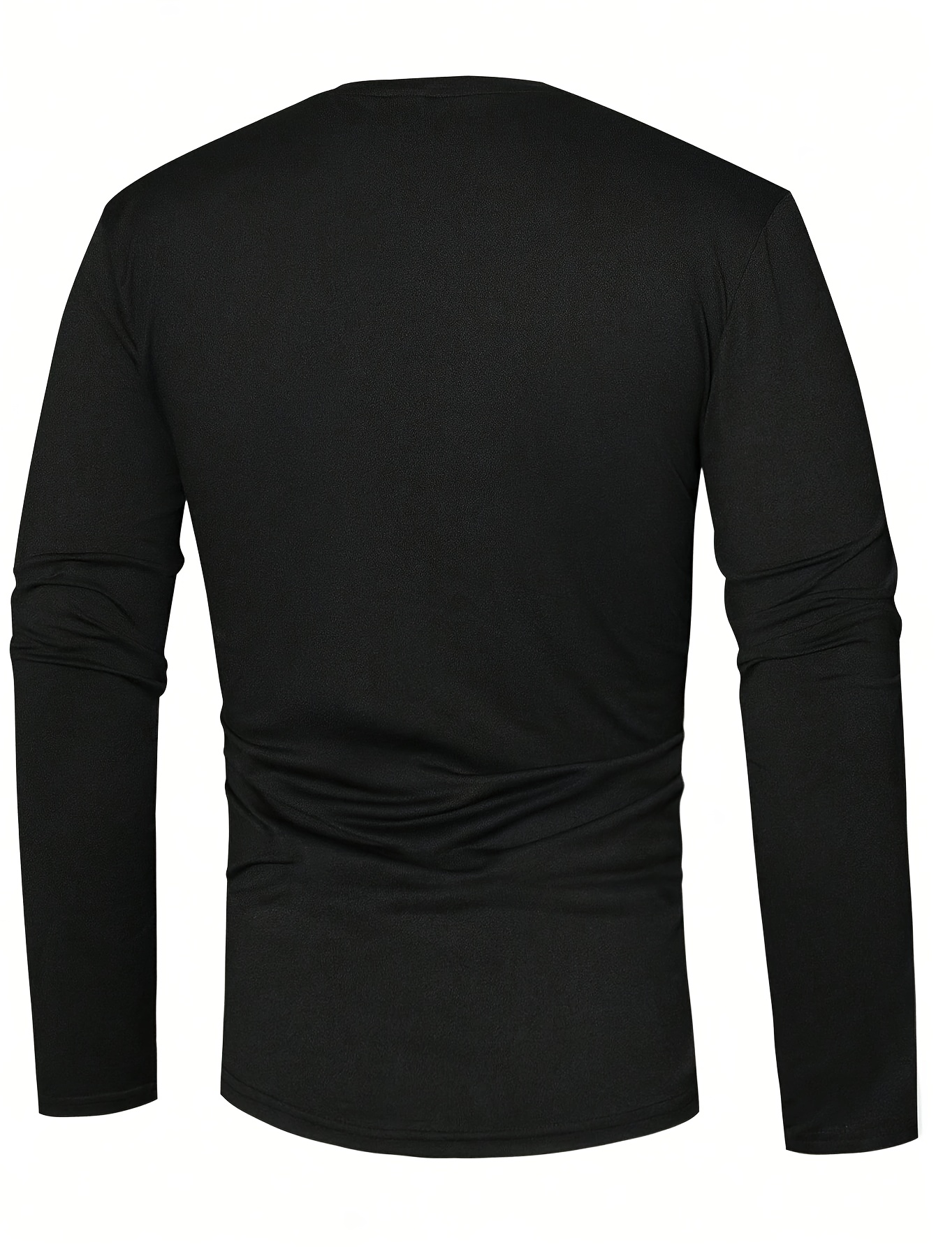 Men'S Black Vintage Henley Top - Solid Long Sleeves, Thermal Undergarment, Loungewear, Sleepwear, Single-Breasted Button Placket, Classic Cut, Soft, Comfy, Breathable Material
