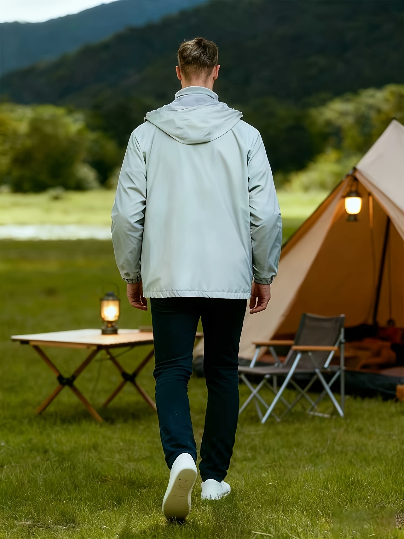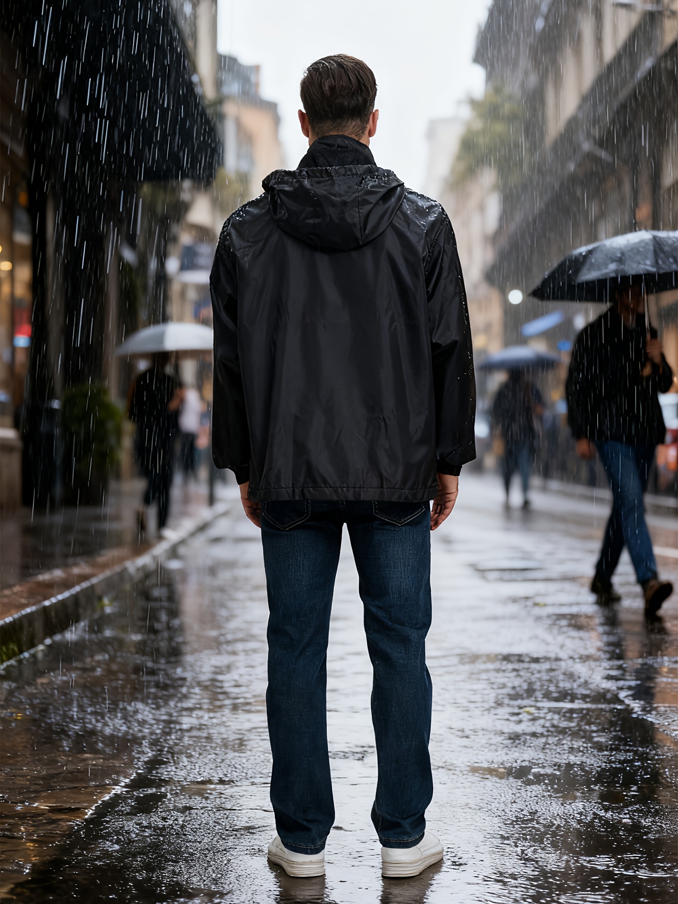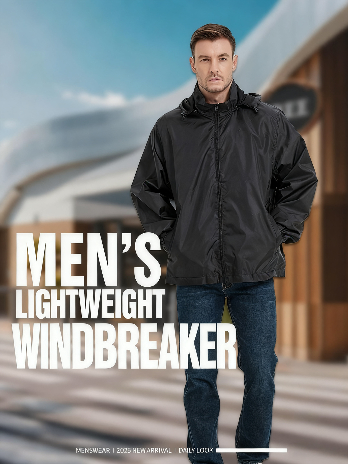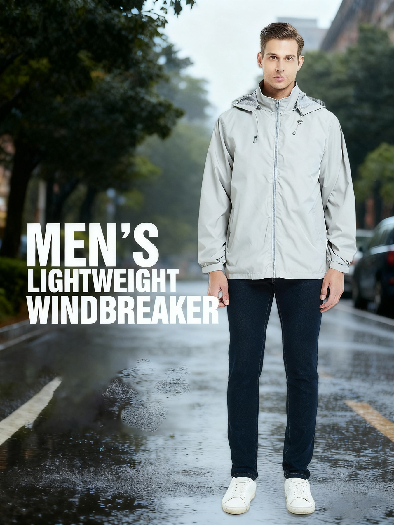 Men's Lightweight Windproof Full-Zip Jacket with Adjustable Hooded Raincoat, Durable Non-Stretch Windbreaker Coat