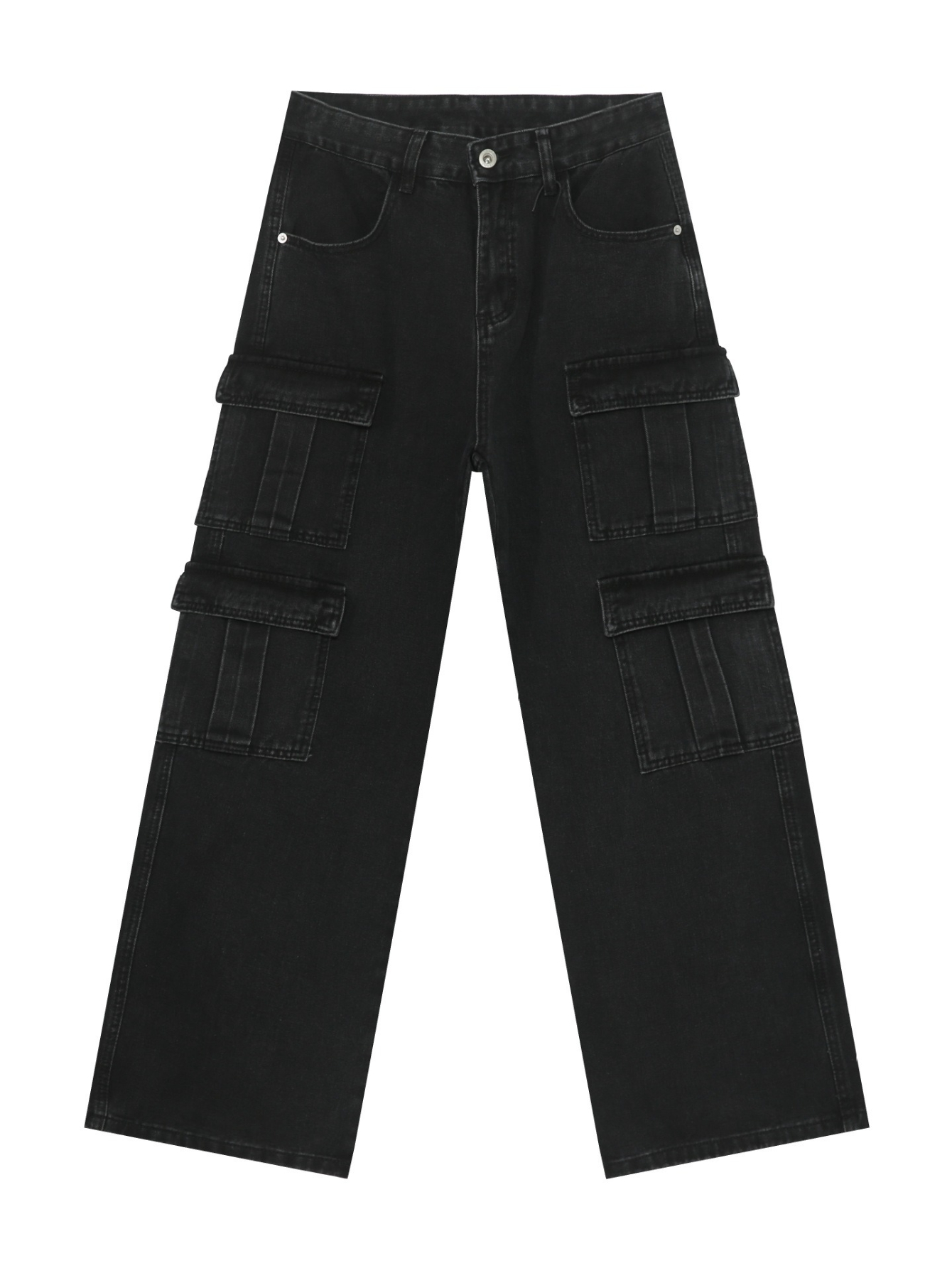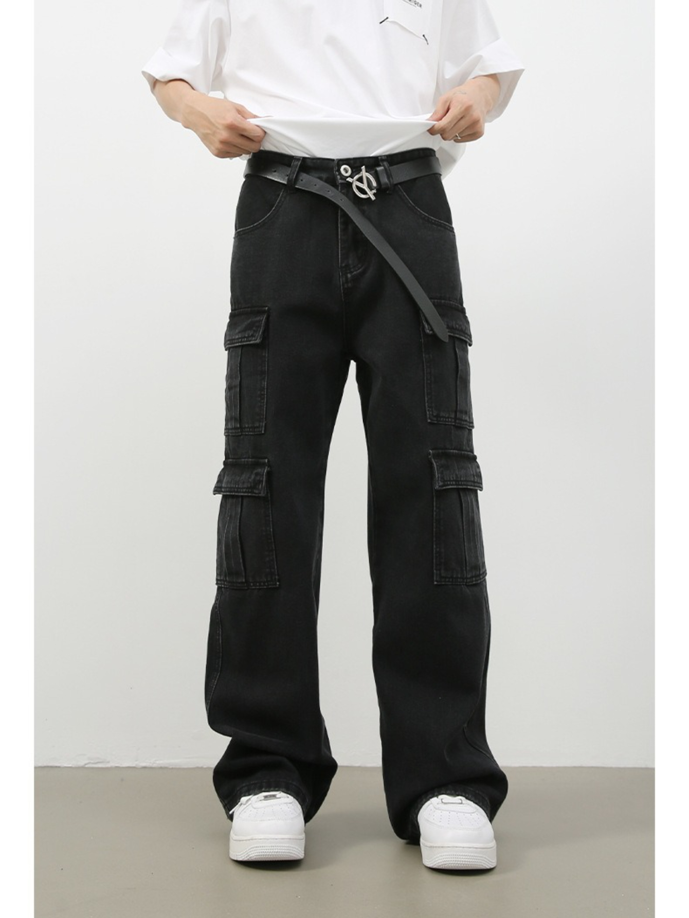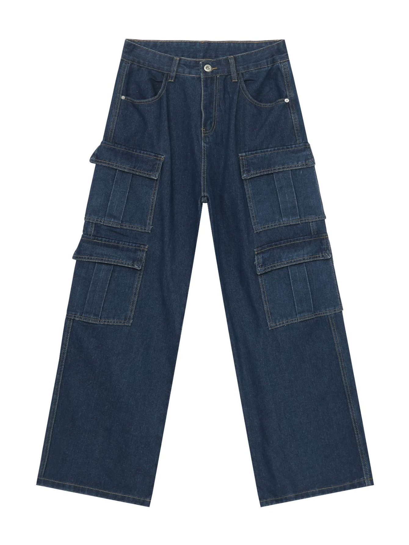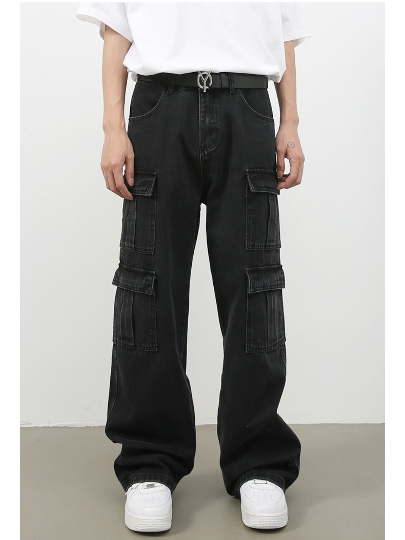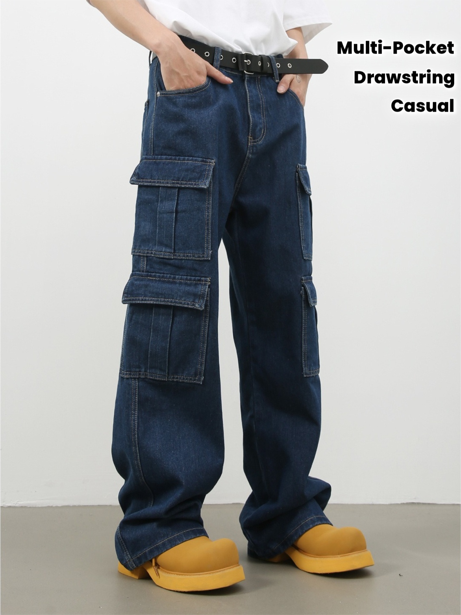 Men's Vintage Washed Denim Jeans - American Retro Multi-Pocket Straight-Leg Work Pants with Beltless Drawstring Waist, Heavy-Duty Cargo Pocket & Washed